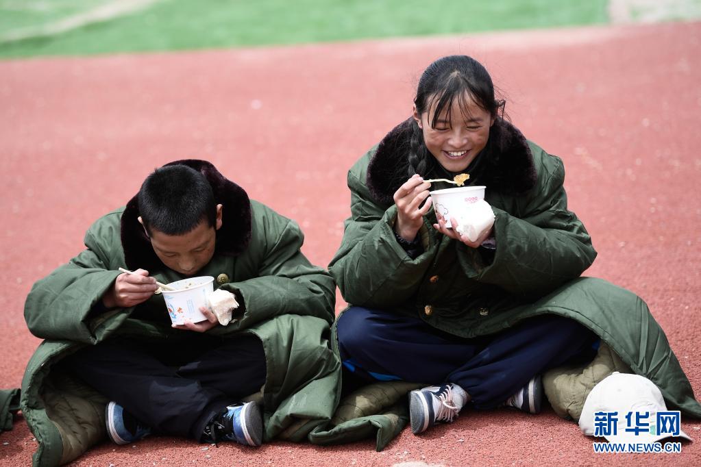 5月24日,曲邁卓瑪(右)與(yu) 同學在瑪多縣民族寄宿製中學吃午飯。新華社 張龍 攝