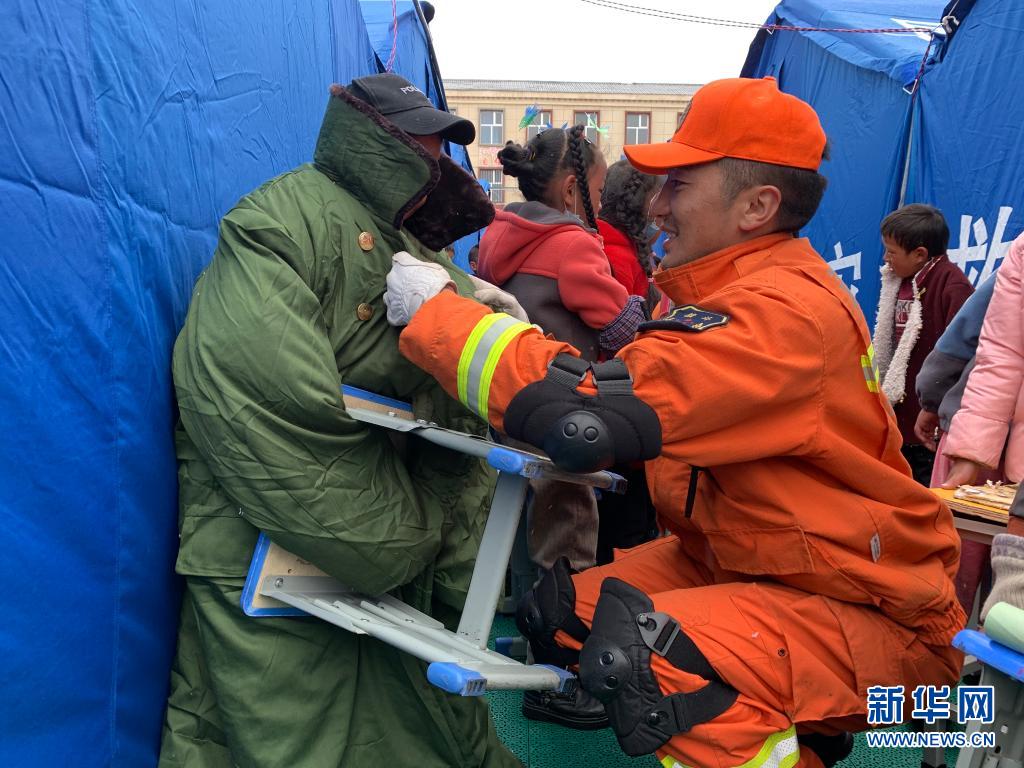 22日,地震發生後,群英尕丁來到安置區搭建帳篷和消防排查,12歲的班瑪華桑就與(yu) 身穿橙色製服的群英尕丁結下了兄弟情誼。“我們(men) 是一輩子的兄弟,這幾天你也要照顧好自己。”群英尕丁笑著囑咐班瑪華桑。