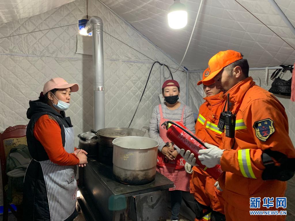 25日,青海瑪多“5·22”7.4級地震災後第四天,瑪多縣城飄起小雪。青海省玉樹藏族自治州消防救援支隊消防員群英尕丁,又來到瑪多縣民族寄宿製中學的安置區日常巡查。