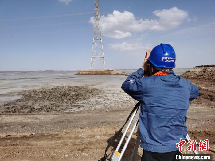 圖為(wei) “電力天路”青藏聯網工程運維人員觀測線路基礎沉降情況。李傑 攝