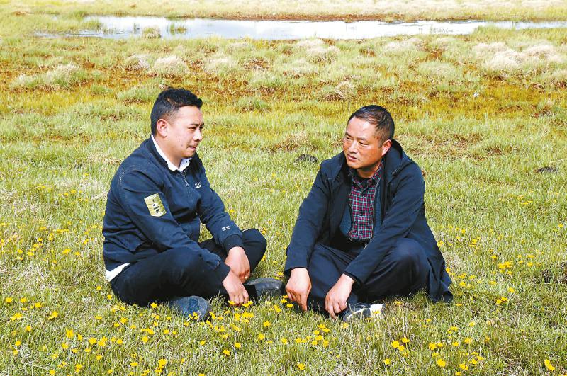 若爾蓋縣科學技術和農(nong) 業(ye) 畜牧局局長張建榮(右)與(yu) 牧民交流。四川日報全媒體(ti) 記者 徐登林 攝