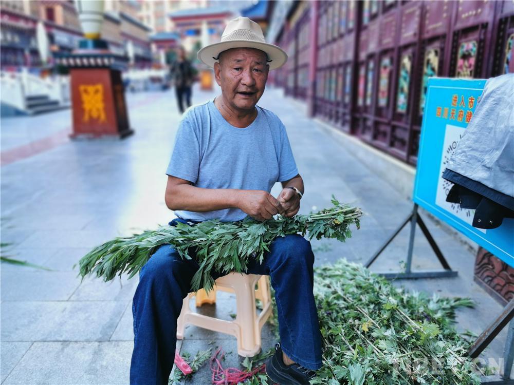 圖為(wei) 藏族大叔在攤位上打包艾葉