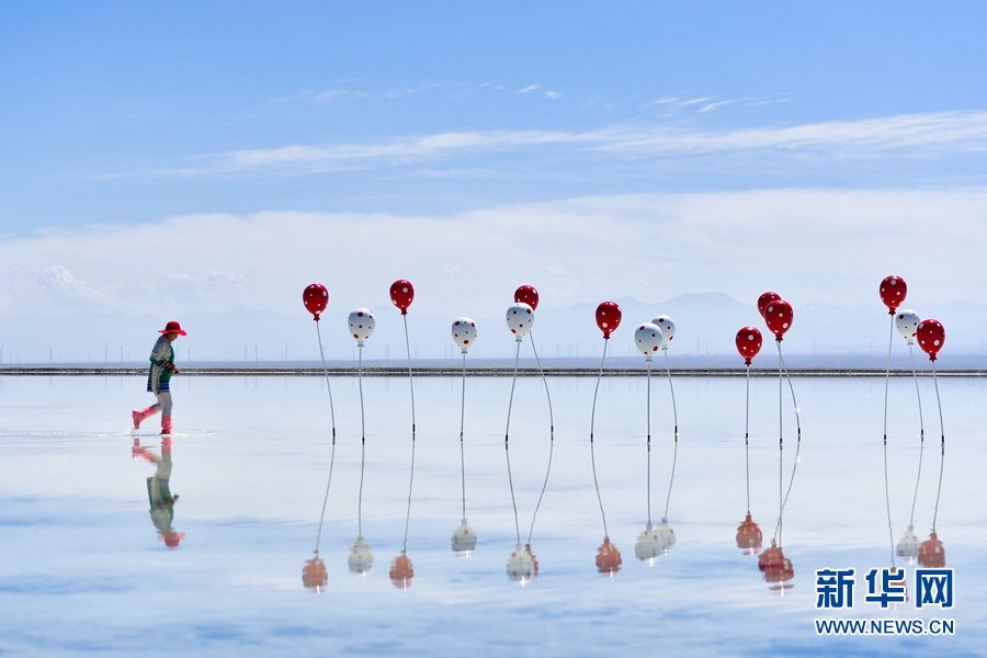 風吹動著遊客手中的紅披肩,為(wei) 鏡麵般的鹽湖添上一抹亮色。遊客孫波拿起相機為(wei) 愛人拍下一張照片。“第二次來茶卡‘打卡’,我發現陰天的茶卡別有一番味道。”孫波說,“我有機會(hui) 還要來,沿著高速把大美青海的景色都看一遍。”