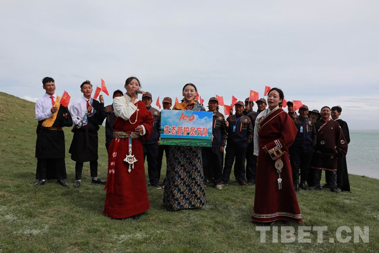圖為(wei) 紮陵湖畔青海牧民生態管護員方隊在歌唱 攝影:才仁當智