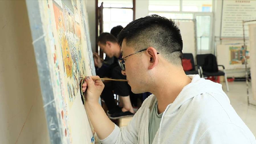 在同仁市隆務鎮吾屯下莊村的熱貢龍樹畫苑裏,170餘(yu) 名學生在這裏學習(xi) 唐卡的製作技藝。他們(men) 手拿畫筆,眼神堅定,專(zhuan) 心細致地落下每一筆。