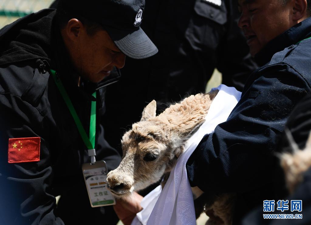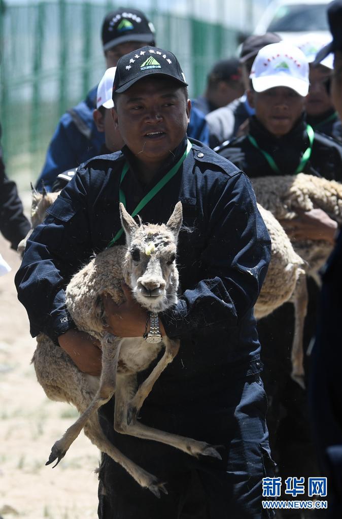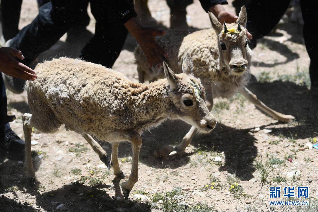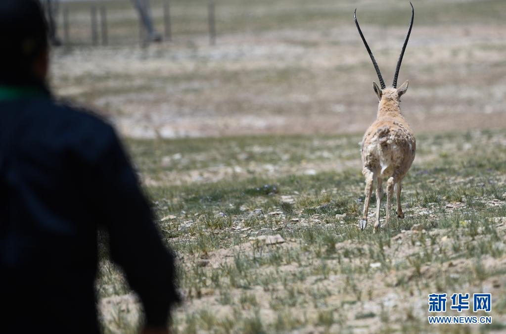 7月7日,在可可西裏索南達傑保護站野生動物救助中心,一隻藏羚羊被放歸大自然。當日,在可可西裏索南達傑保護站野生動物救助中心,三公兩(liang) 母共五隻人工救助的藏羚羊被放歸大自然。新華社記者 張龍 攝