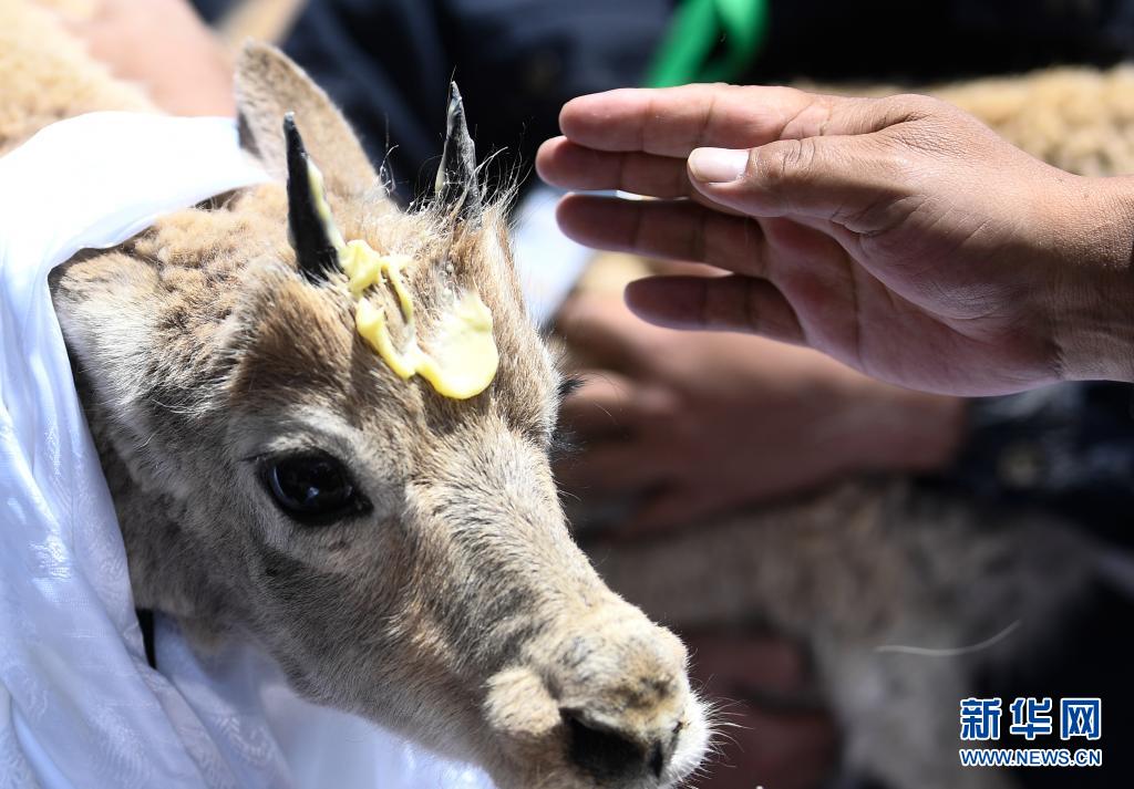 7月7日,在可可西裏索南達傑保護站野生動物救助中心,可可西裏巡山隊員按照風俗,在藏羚羊額頭上塗抹酥油表達祝福。新華社記者 張龍 攝