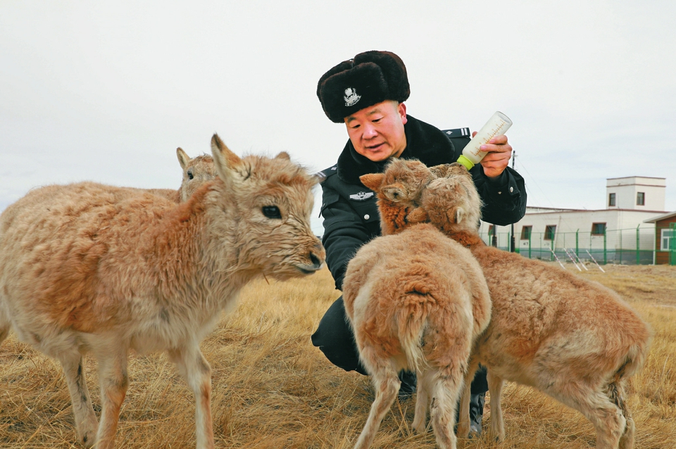 索南達傑保護站站長趙新錄在給藏羚羊幼仔喂奶。新華社發