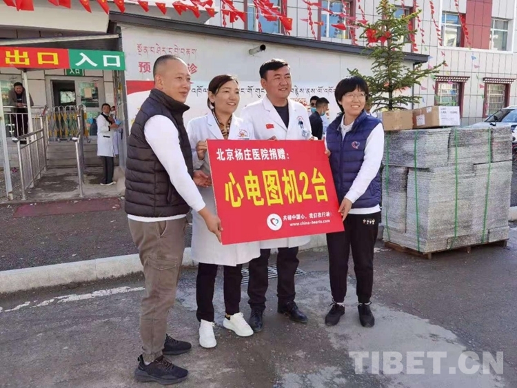 圖為(wei) 馮(feng) 亞(ya) 靜和韓菲代表石景山楊莊醫院向久治縣醫院贈送兩(liang) 台心電圖機