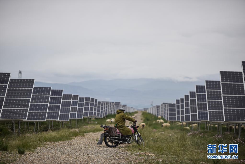 一名牧民在青海省海南藏族自治州共和縣光伏產(chan) 業(ye) 園區內(nei) 放牧(2019年6月16日攝)。新華社 吳剛 攝