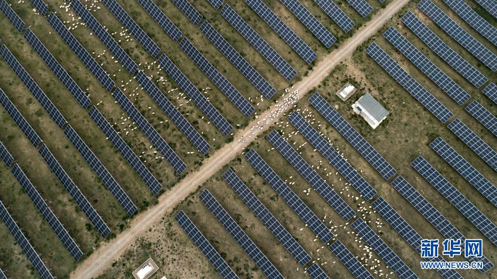 羊群在青海省海南藏族自治州共和縣光伏產(chan) 業(ye) 園吃草(2019年6月16日攝,無人機照片)。新華社 吳剛 攝