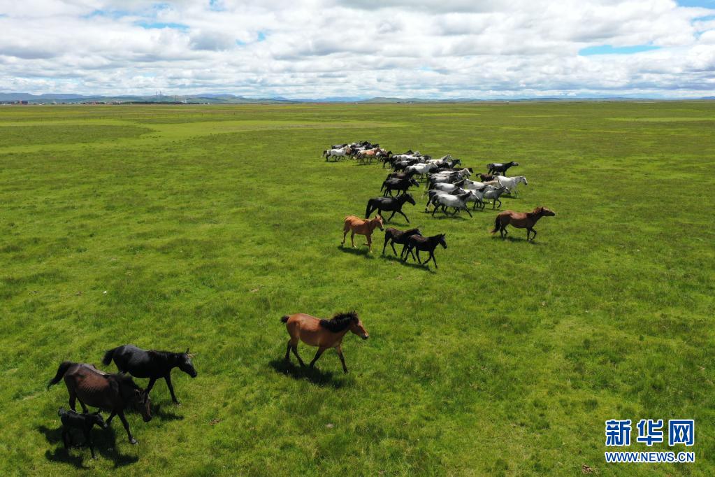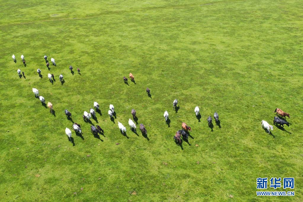 這是7月15日在甘肅瑪曲縣河曲馬場拍攝的河曲馬(無人機照片)。 新華社記者 杜哲宇 攝
