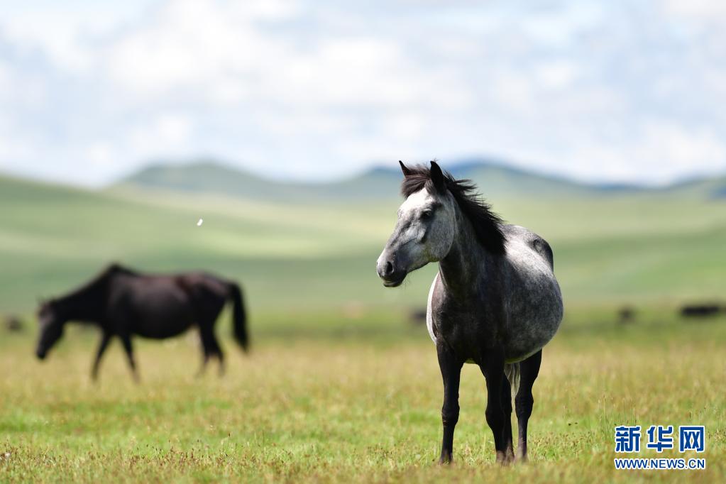 這是7月15日在甘肅瑪曲縣河曲馬場拍攝的河曲馬。新華社記者 杜哲宇 攝