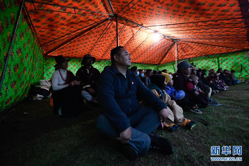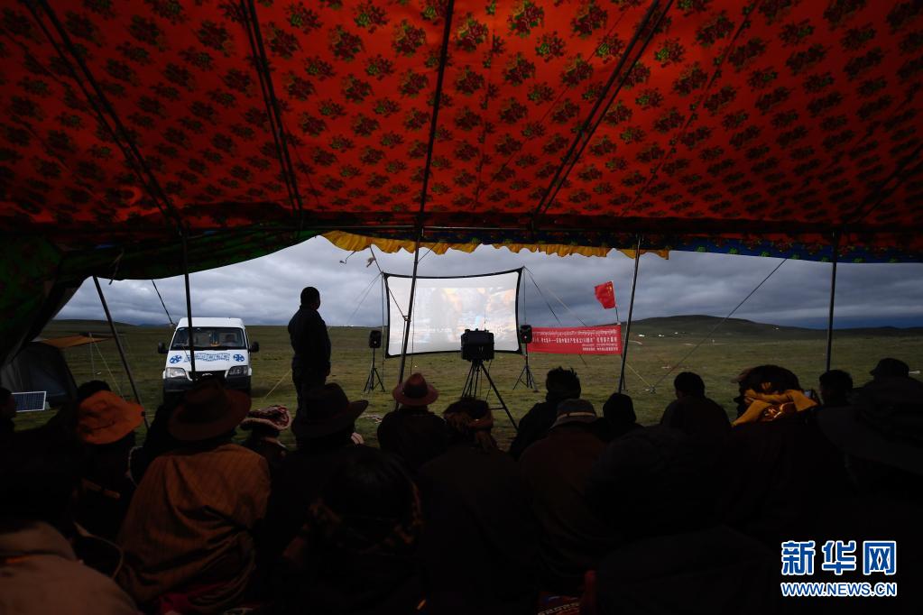 8月3日,在瑪沁縣當洛鄉(xiang) 貢龍村的夏季草場上,牧民群眾(zhong) 在看電影。新華社記者 張龍 攝