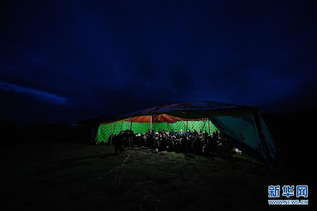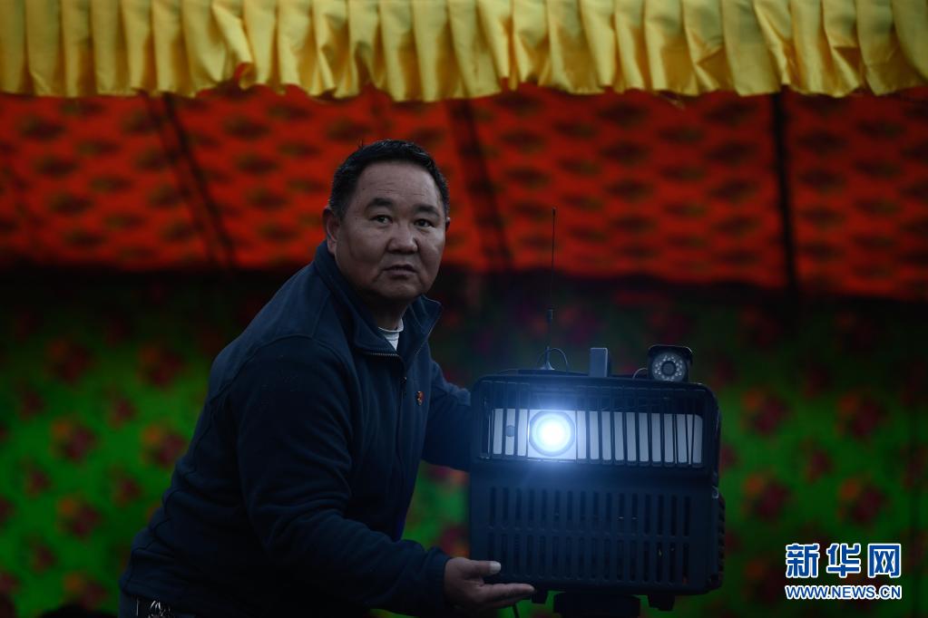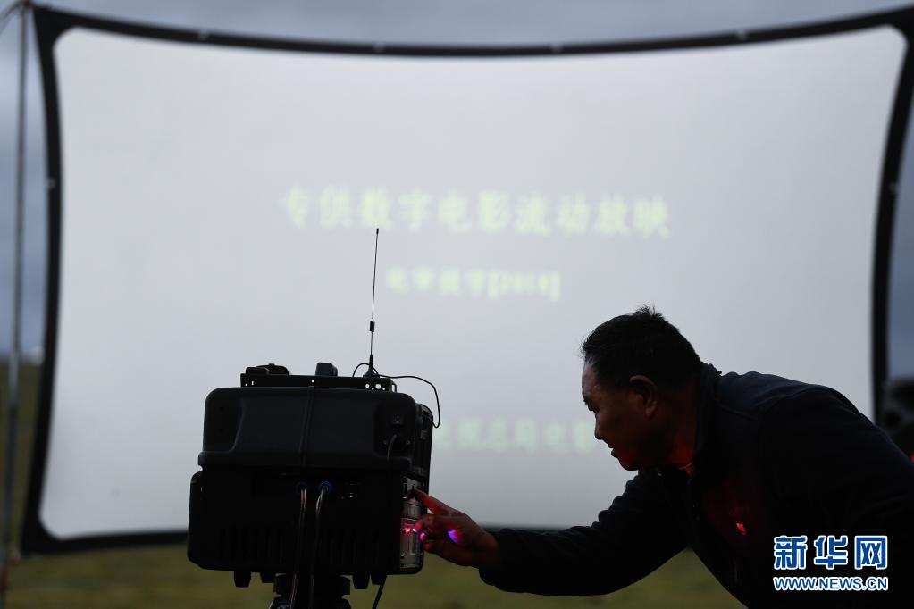 8月3日,在瑪沁縣當洛鄉(xiang) 貢龍村的夏季草場上,南拉才讓為(wei) 牧民放電影。新華社記者 張龍 攝