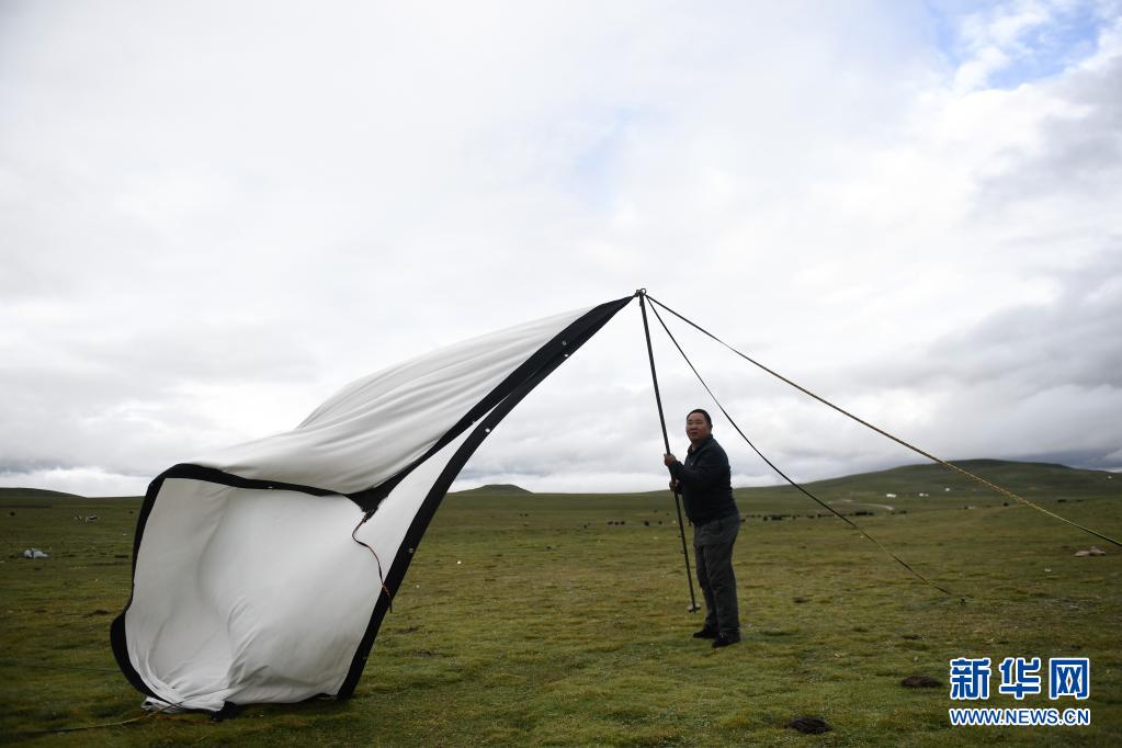 8月3日,在瑪沁縣當洛鄉(xiang) 貢龍村的夏季草場上,南拉才讓在搭設電影幕布。新華社記者 李占軼 攝