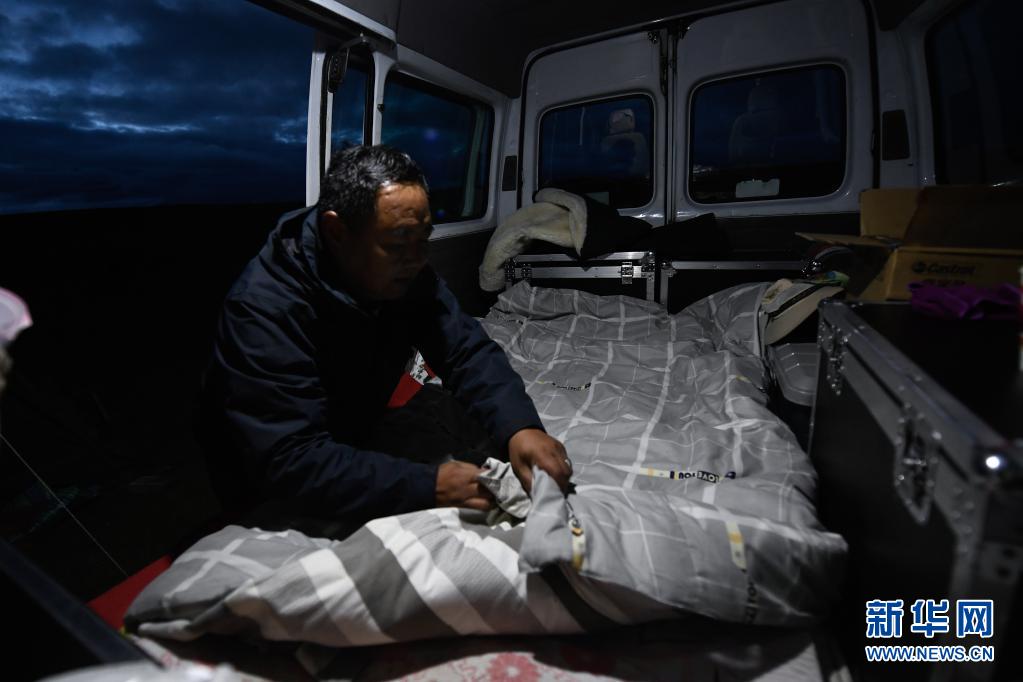 8月3日,在瑪沁縣當洛鄉(xiang) 貢龍村的夏季草場上,南拉才讓在放映車中整理床鋪。每次到草原上放電影,南拉才讓都睡在車裏。新華社記者 張龍 攝