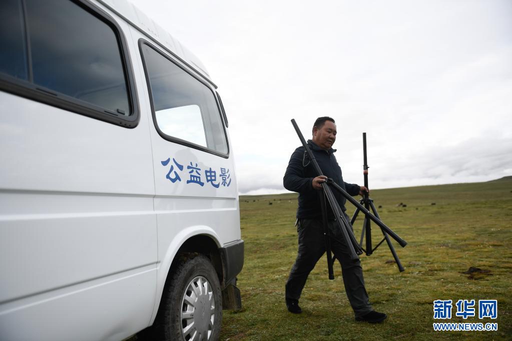 8月3日,在瑪沁縣當洛鄉(xiang) 貢龍村的夏季草場上,南拉才讓在布置放映器材。新華社記者 李占軼 攝