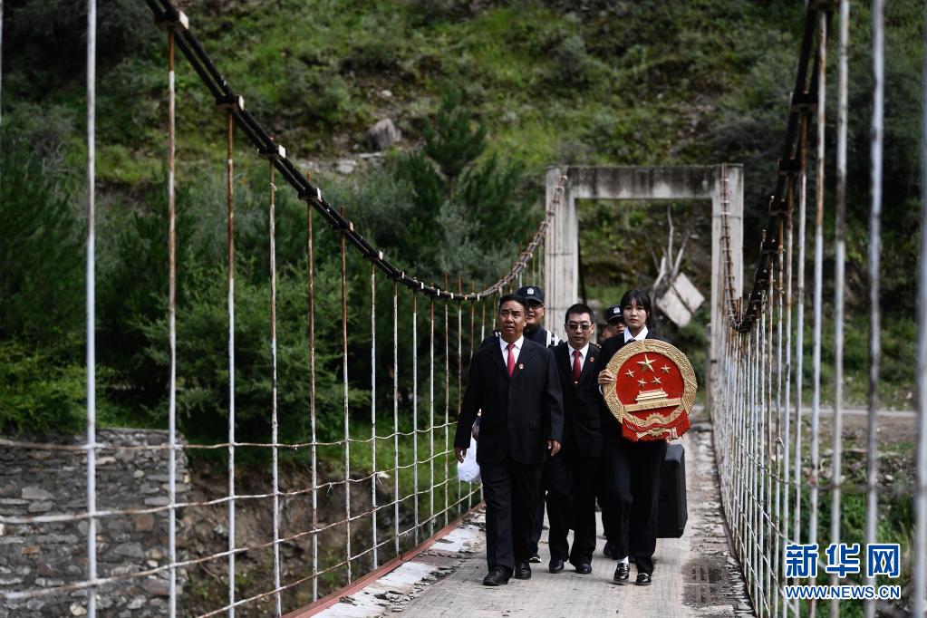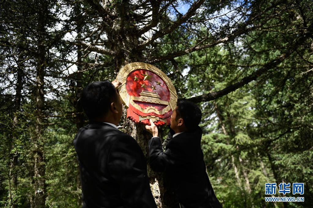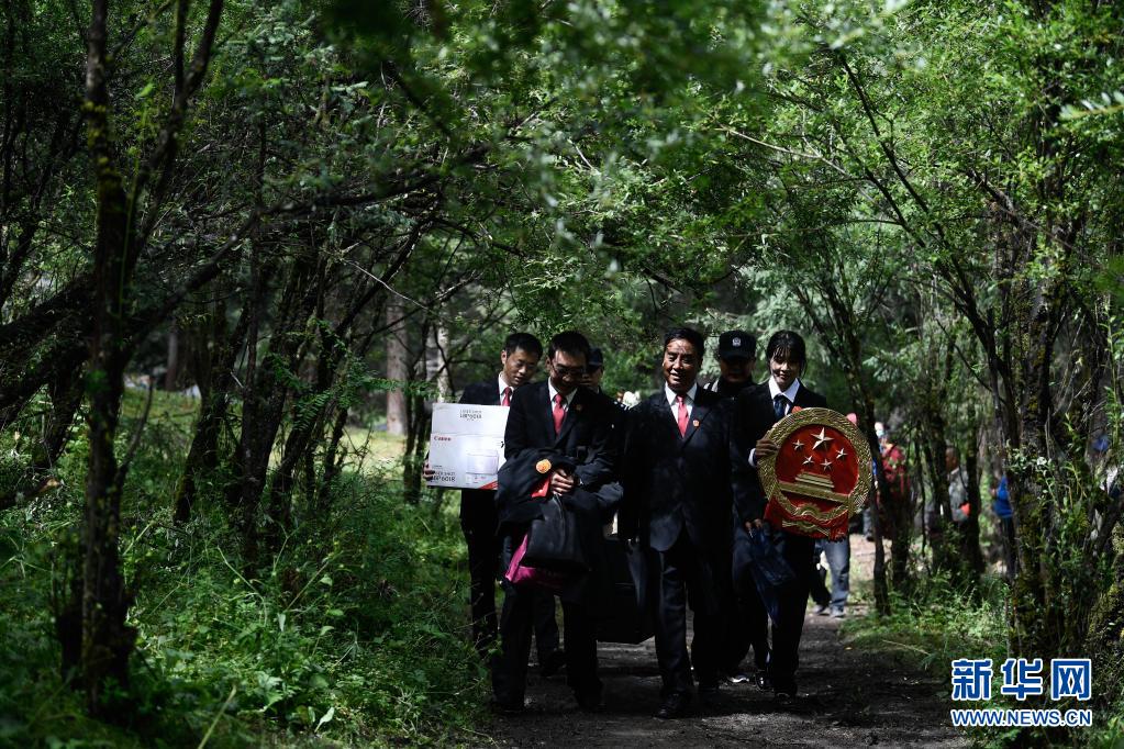 8月7日,班瑪縣人民法院工作人員在林區懸掛國徽,布設巡回法庭。新華社記者 張龍 攝