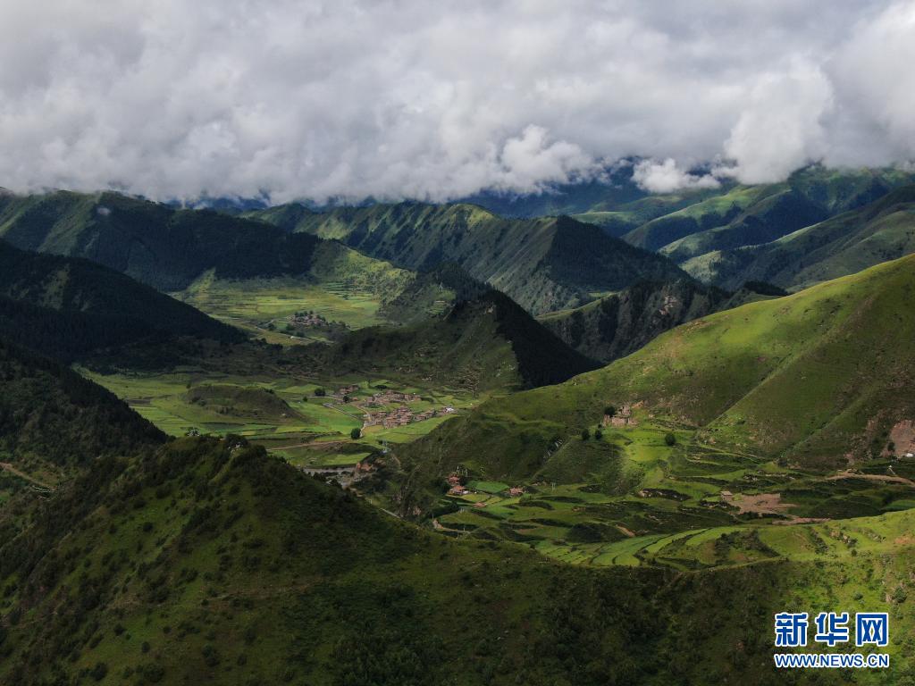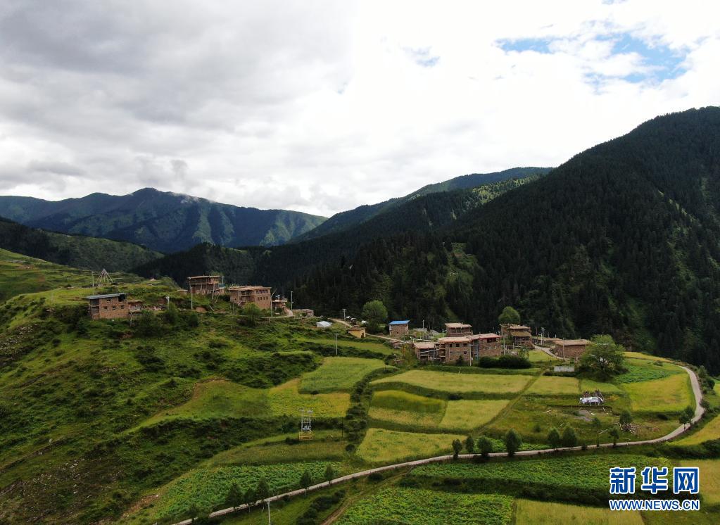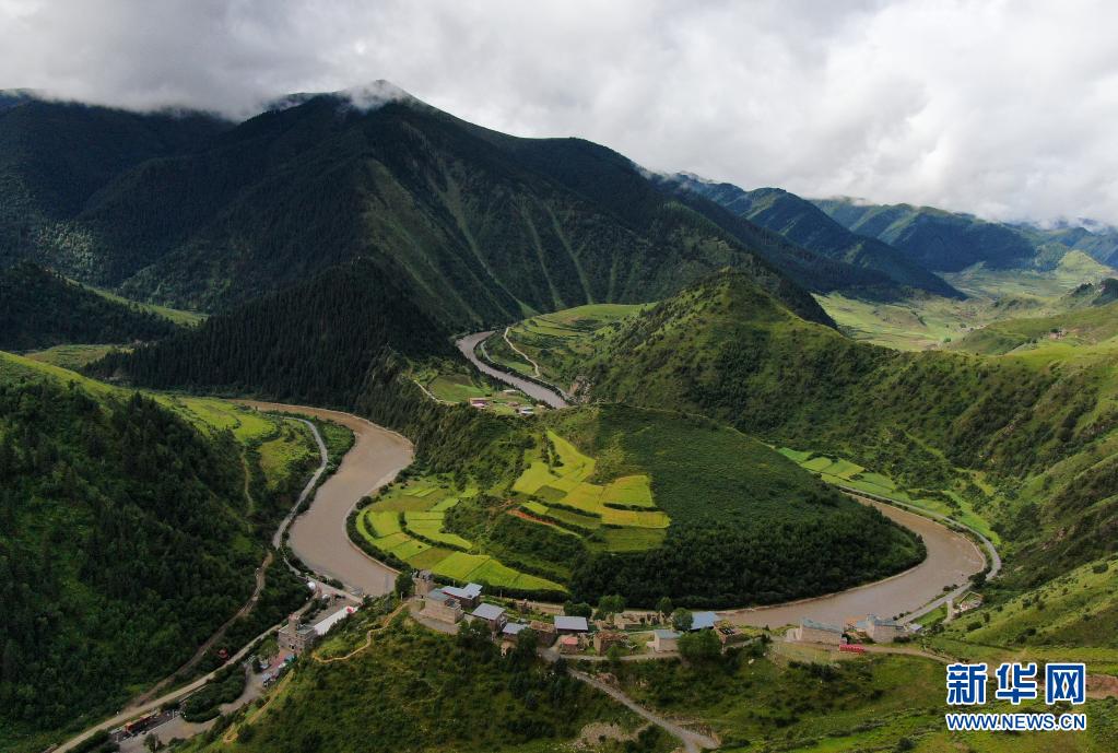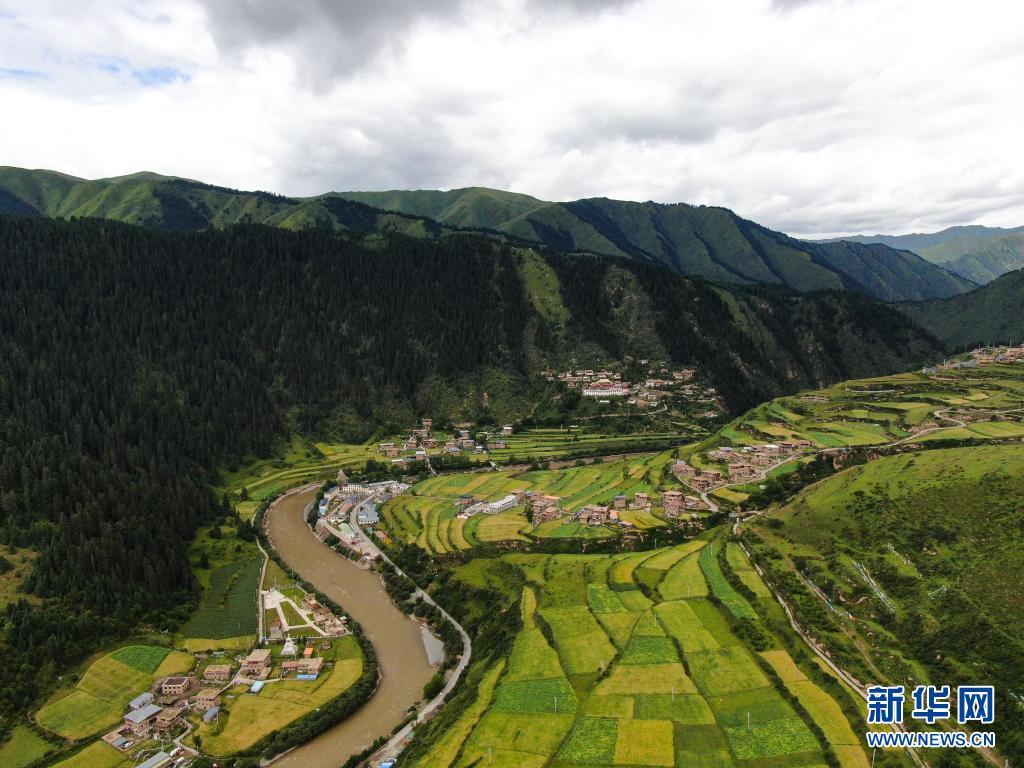 8月7日在青海省果洛藏族自治州班瑪縣境內(nei) 拍攝的村莊景色(無人機照片)。新華社記者 張龍 攝