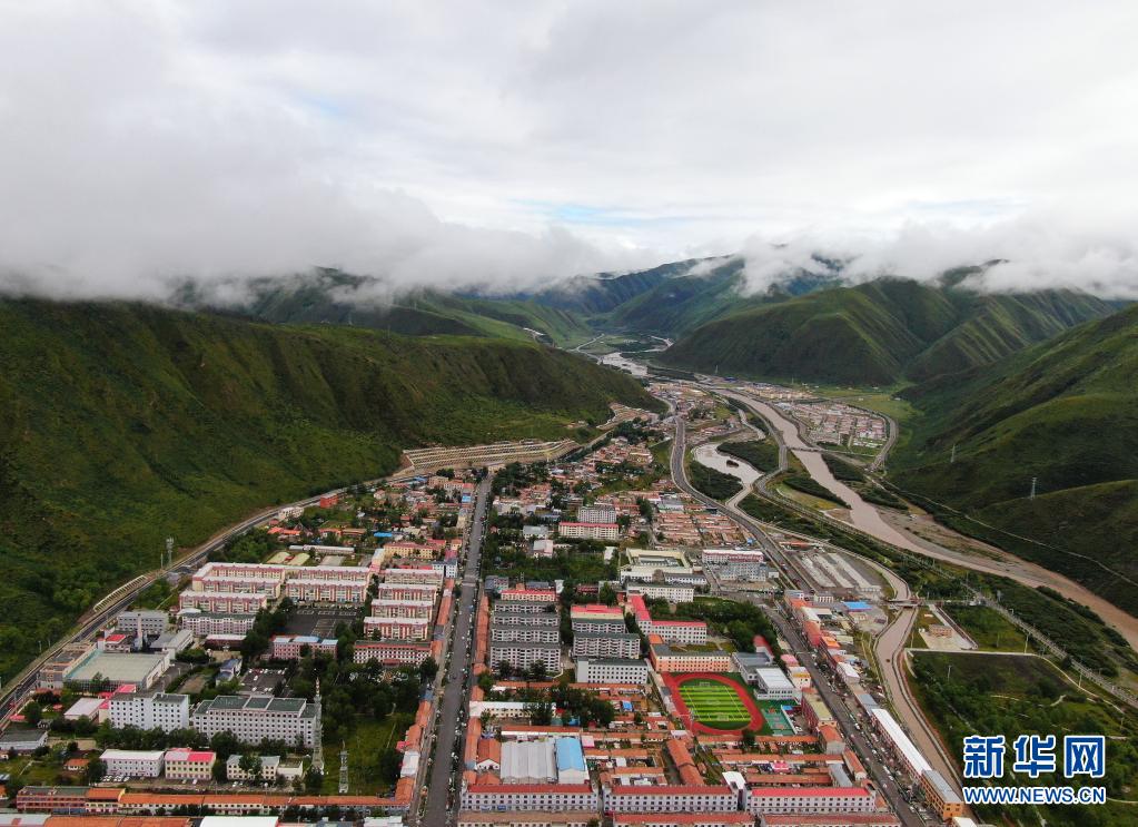8月8日在青海省果洛藏族自治州班瑪縣境內(nei) 拍攝的縣城景色(無人機照片)。新華社記者 張龍 攝