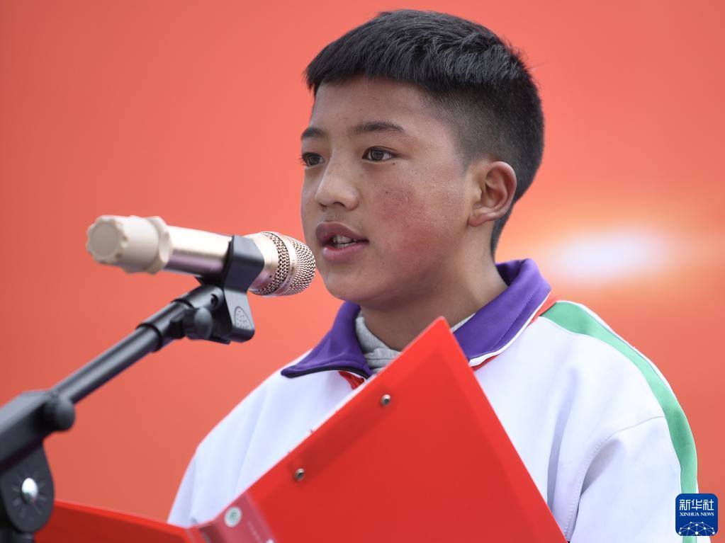 9月1日,在位於(yu) 果洛藏族自治州瑪沁縣的瑪多地震災後過渡安置一校區,學生科熱在國旗下講話。新華社記者 張龍 攝