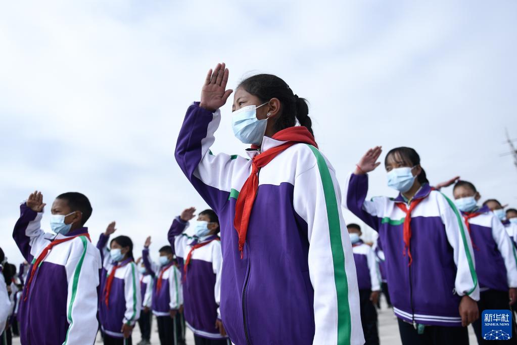 9月1日,在位於(yu) 果洛藏族自治州瑪沁縣的瑪多地震災後過渡安置一校區,學生參加升旗儀(yi) 式。新華社記者 張龍 攝