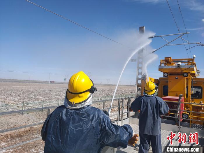 青藏鐵路從(cong) 青海省海西州察爾汗鹽湖橫穿而過,成為(wei) 世界上唯一一條建在鹽湖上的鐵路,而這一段約33公裏的線路也被稱為(wei) “萬(wan) 丈鹽橋”。察爾汗鹽湖區域空氣中鹽分含量高,很容易在鐵路牽引供電接觸網設備上形成鹽汙,造成線路跳閘,甚至導致大麵積停電,誘發行車安全事故。為(wei) 了保障青藏鐵路的暢通運行,青藏集團公司西寧供電段格爾木大修車間將對管內(nei) 鹽汙區段牽引供電設備進行為(wei) 期20天的清洗工作。