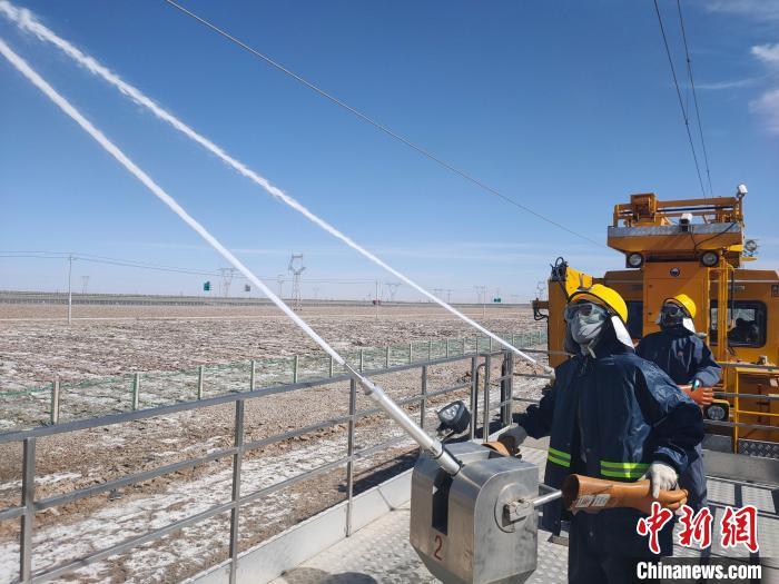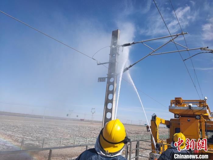 圖為(wei) 接觸網清洗車在清洗鹽汙區段的接觸網絕緣子。周賀 攝