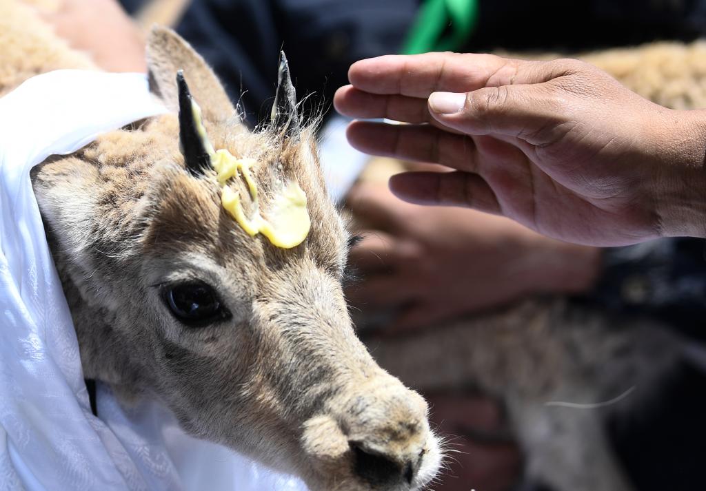 7月7日,在可可西裏索南達傑保護站野生動物救助中心,可可西裏巡山隊員按照風俗,在即將回歸大自然的藏羚羊額頭上塗抹酥油表達祝福。 新華社記者 張龍攝
