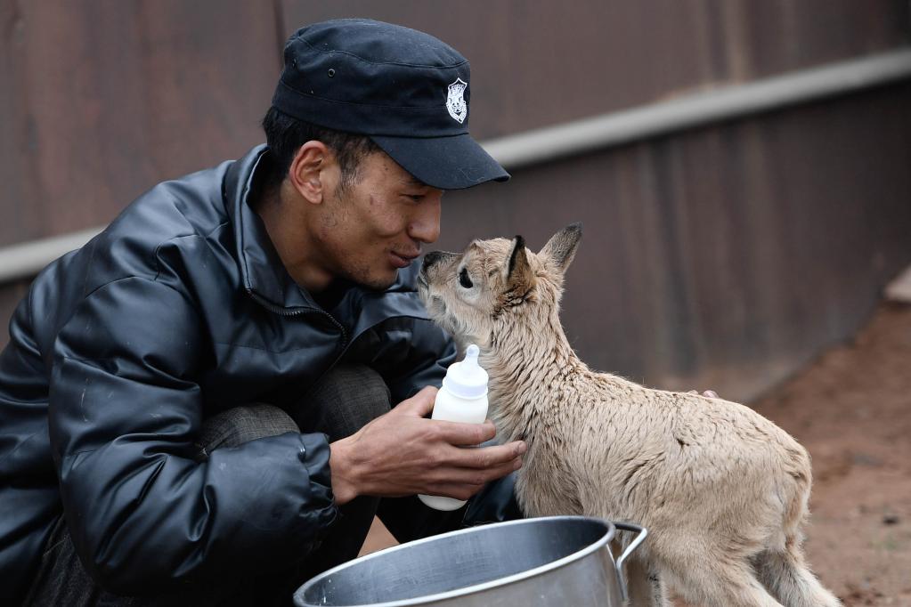 2020年7月8日,三江源國家公園管理局長江源園區可可西裏管理處卓乃湖保護站的工作人員才文多傑在給一隻藏羚羊幼仔喂奶。 新華社記者 張龍 攝