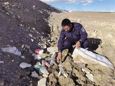 可可西裏索南達傑保護站工作人員在109國道沿線撿拾被丟(diu) 棄的垃圾。可可西裏管理處供圖