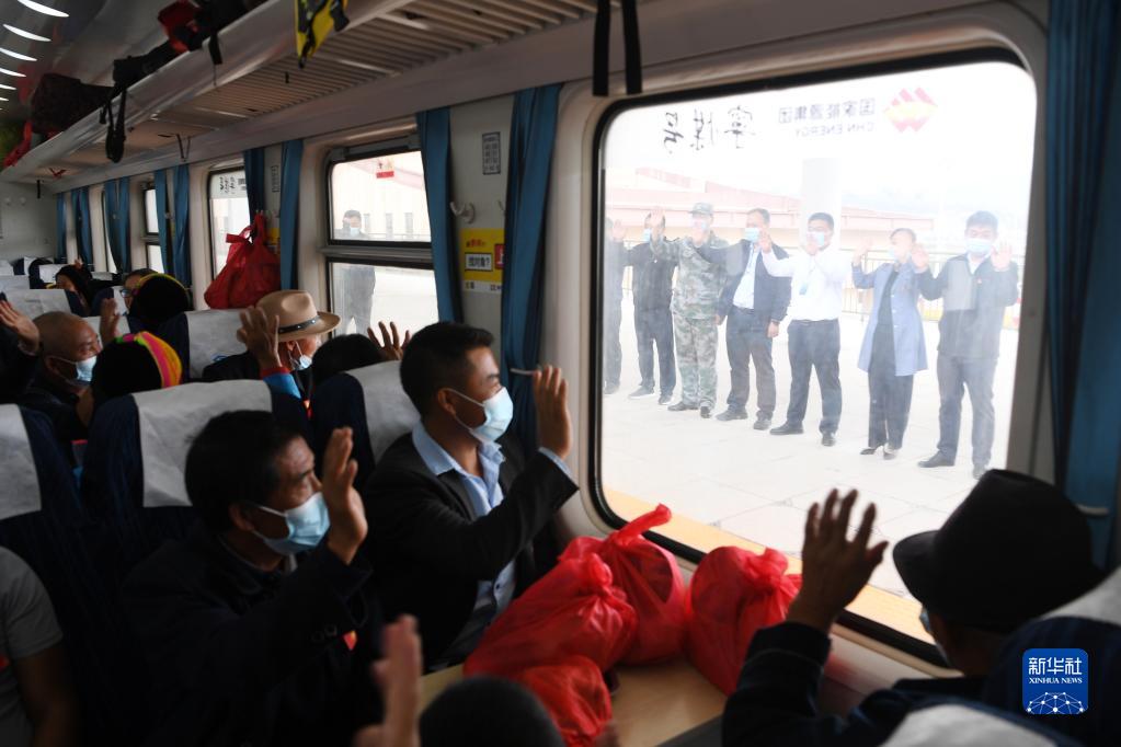 9月24日,在舟曲避險搬遷“感恩號”專(zhuan) 列上,避險搬遷居民與(yu) 家鄉(xiang) 幹部群眾(zhong) 告別。新華社記者 範培珅 攝