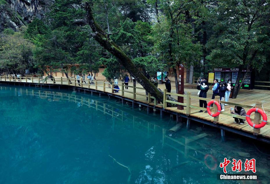 9月27日,四川阿壩,遊客在九寨溝景區遊覽。王磊 攝