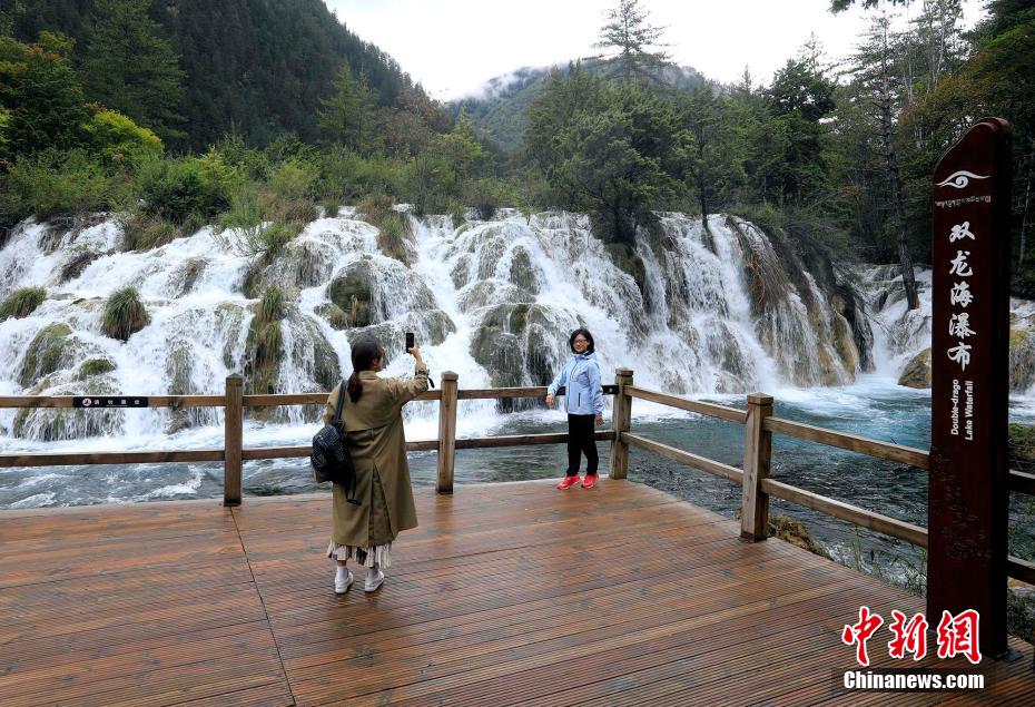 9月27日,四川阿壩,遊客在九寨溝景區雙龍海瀑布前拍照。王磊 攝