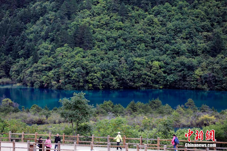 9月27日,四川阿壩,遊客在九寨溝景區樹正群海遊覽。王磊 攝