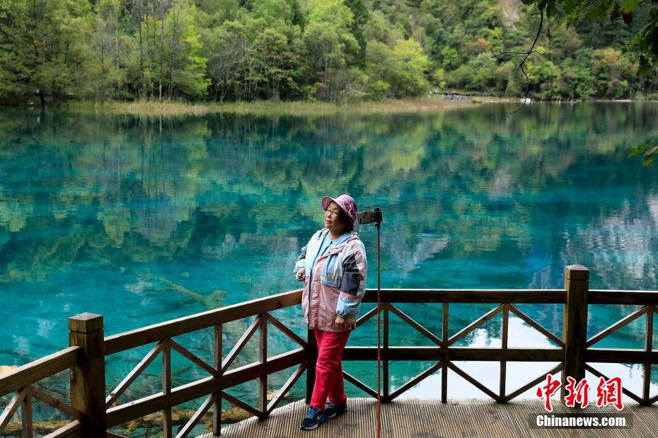 9月27日,四川阿壩,遊客在九寨溝景區自拍留影。王磊 攝