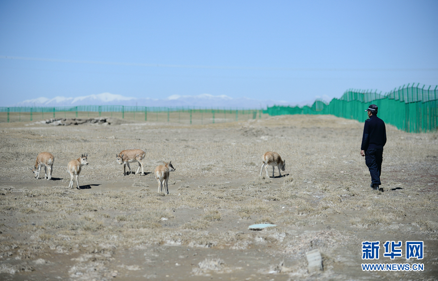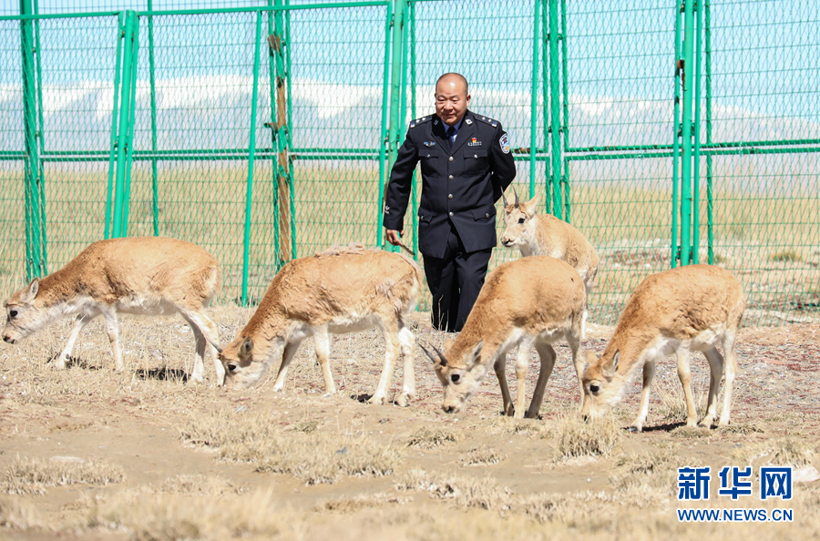 在可可西裏國家級自然保護區索南達傑保護站,站長趙新錄與(yu) 藏羚羊在一起(9月28日攝)。新華社記者 李占軼 攝