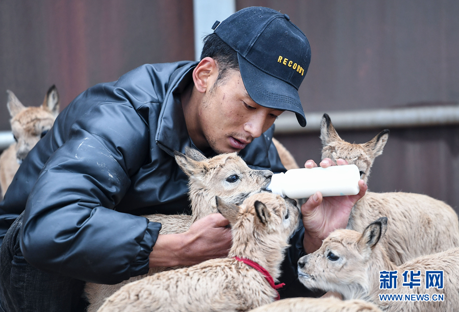 可可西裏國家級自然保護區卓乃湖保護站的工作人員才文多傑在給藏羚羊幼仔喂奶(2020年7月7日攝)。新華社記者 薛玉斌 攝
