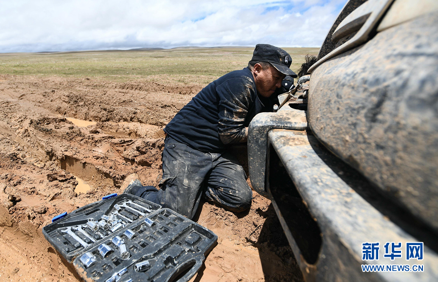 可可西裏國家級自然保護區卓乃湖保護站站長秋培紮西在可可西裏地區修理車輛(2020年7月6日攝)。新華社記者 薛玉斌 攝