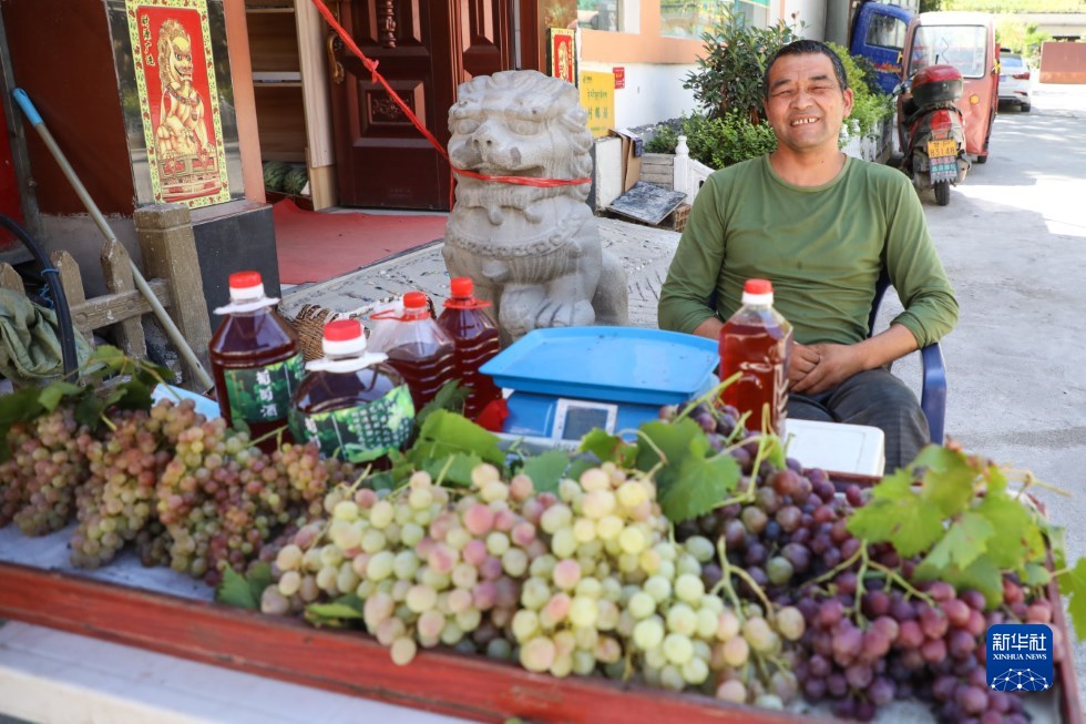 9月7日,在舟曲縣大川鎮土橋子村,村民擺攤售賣自家采摘的葡萄。新華社記者 馬希平 攝