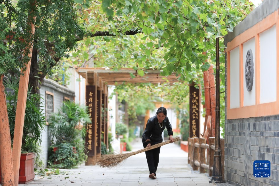 10月13日,在舟曲縣大川鎮土橋子村,村民打掃自家門前落葉。新華社記者 馬希平 攝