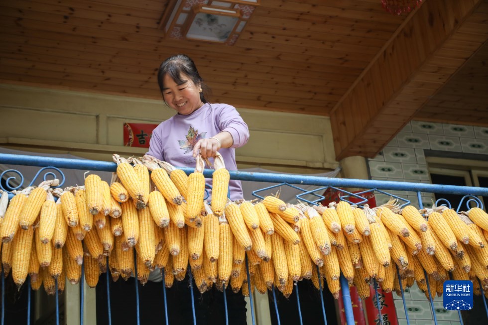 10月13日,舟曲縣大川鎮土橋子村村民在家中翻曬玉米。新華社記者 馬希平 攝