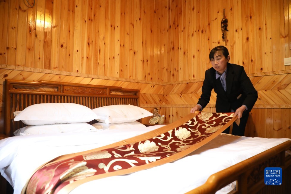 10月13日,服務員在舟曲縣巴藏鎮前北山村各皂壩生態園的民宿裏整理床鋪。新華社記者 馬希平 攝