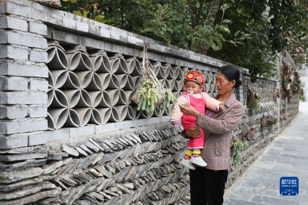 10月13日,舟曲縣巴藏鎮前北山村村民帶孩子在村裏散步。新華社記者 馬希平 攝