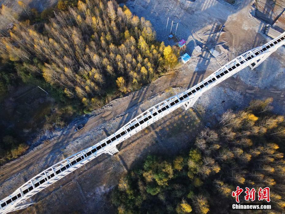 10月16日,航拍青海省海南藏族自治州貴德縣拉西瓦灌溉工程中建設的渡槽。中新社記者 馬銘言 攝