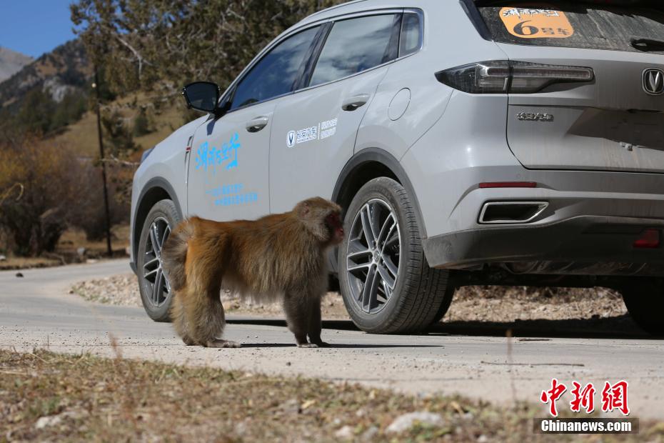 圖為(wei) 一隻藏獼猴近距離接觸2021瀾湄萬(wan) 裏行活動用車。張希紅 攝