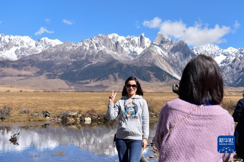 遊客在四川甘孜巴塘縣措普溝景區內(nei) 拍照留念(10月24日攝)。新華社記者 胥冰潔 攝