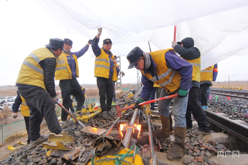 但這還不夠,為(wei) 了讓鋼軌充分舒放“筋骨”、釋放應力,職工們(men) 還必須切開鋼軌,緊接著進行焊聯,這項工作由德令哈重點維修車間負責。車間主任郭鋒亮一邊組織職工開動切割機實施精準切割,一邊組織職工架起焊鍋。火花飛舞,火苗竄升,作業(ye) 人員的對比服在火光和風雪的映襯下顯得更加熠熠生輝。最終,做完“伸展運動”的鋼軌在焊劑的作用下重新融合在了一起,經打磨後再難區分彼此。