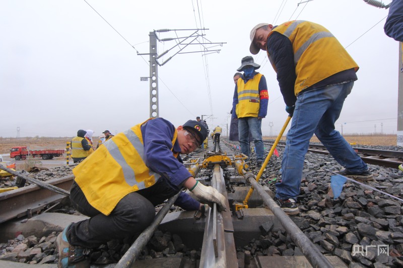 陰沉的雨雪天氣,讓海拔3000米的天地更顯蒼茫,在德令哈線路車間主任包生輝指揮下,職工沿2公裏的線路一字排開,運用機具逐一為(wei) 14080餘(yu) 個(ge) 扣件鬆開螺栓的“束縛”,同時撤下膠墊、放入滾筒,讓鋼軌得以自由伸展。現場“突突突”的響聲此起彼伏,呼出的哈氣隨處可見。